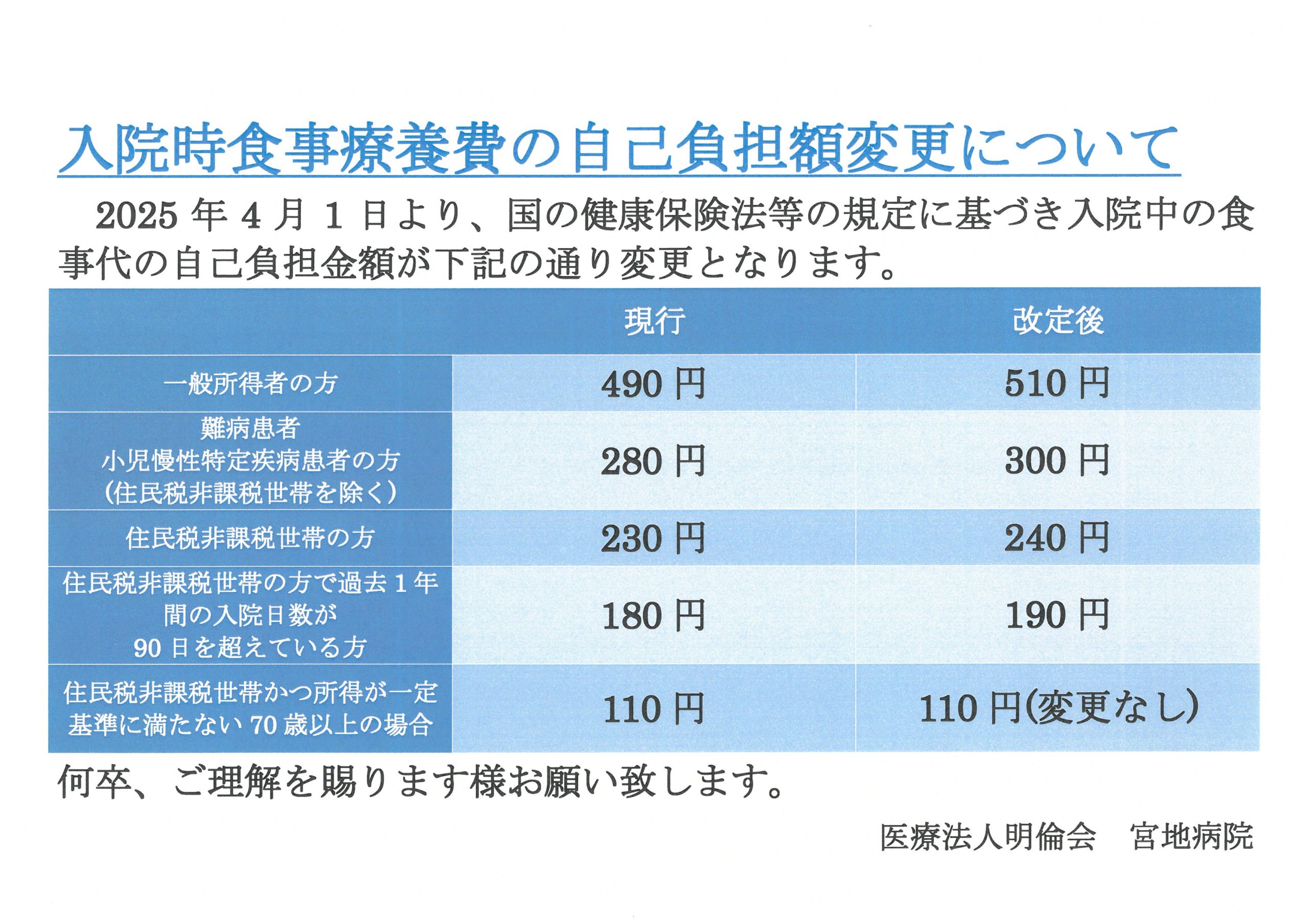 令和7年4月1日より、国の健康保険法等の規定に基づき入院中の食事代の自己負担金額が下記のとおり変更となります。