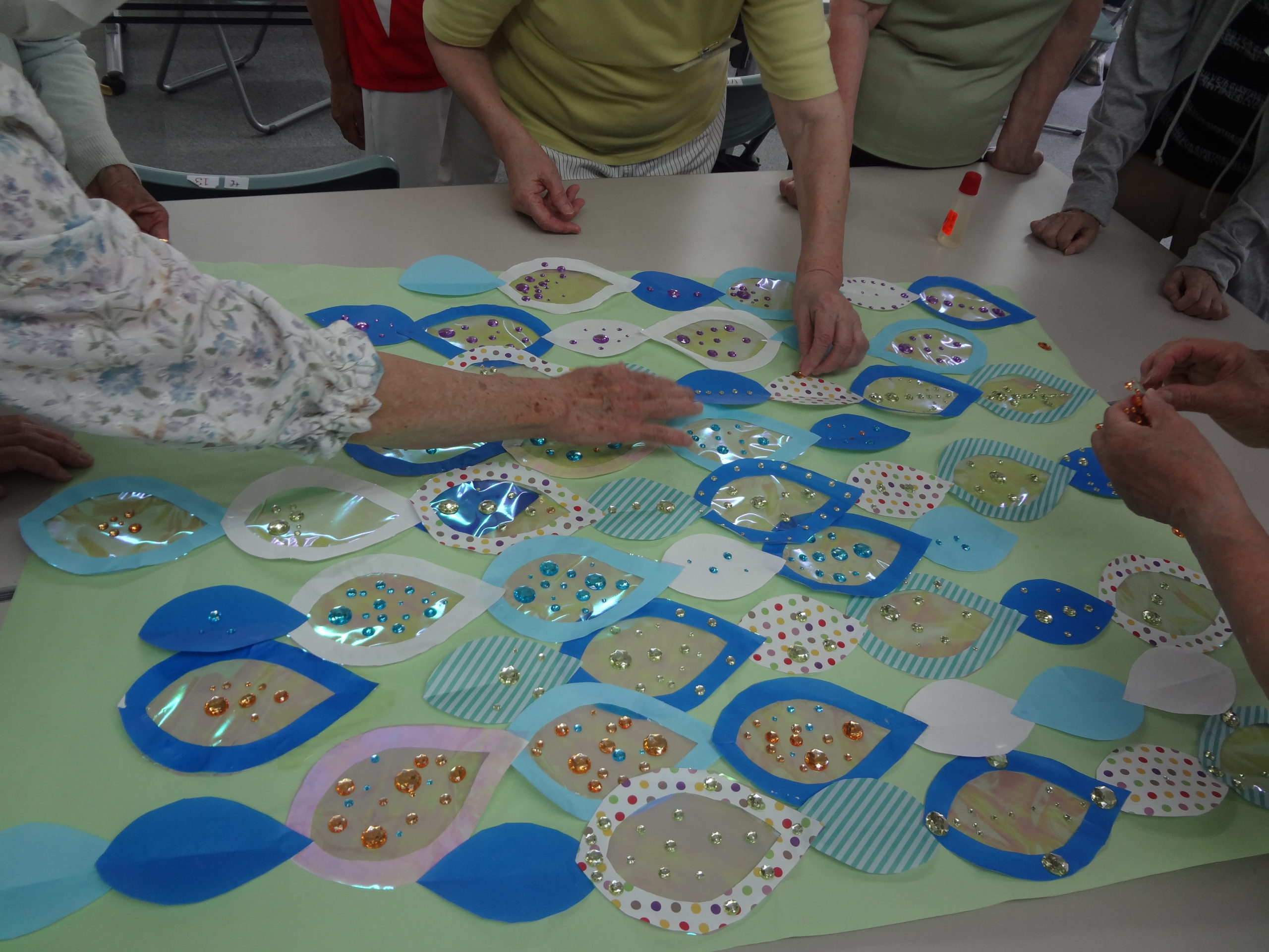 クラフトは、しずくを模した飾りです。紙をきれいにくりぬいてセロハンを貼っていきます。ところどころにシールを貼って、きらきら光が反射するように仕上げました。作品は、宮地病院1階北口に展示しています。ドアを開けると風に吹かれてひらひらとしずくが舞います。光を反射したきらきらシールが何とも言えず奇麗です。毎回素敵なアイディアで参加者皆さんを楽しませてくださるボランティアさんに感謝です。