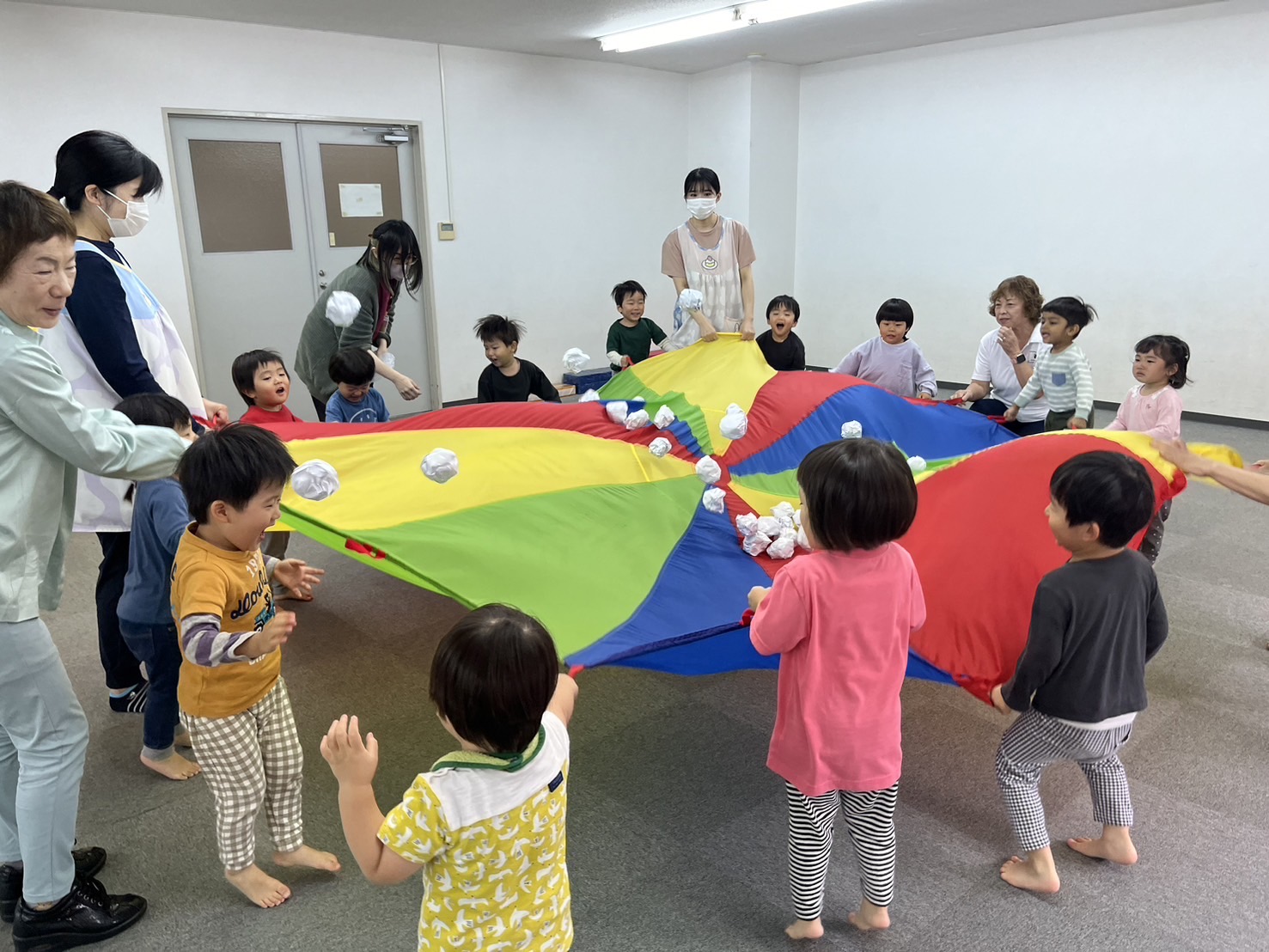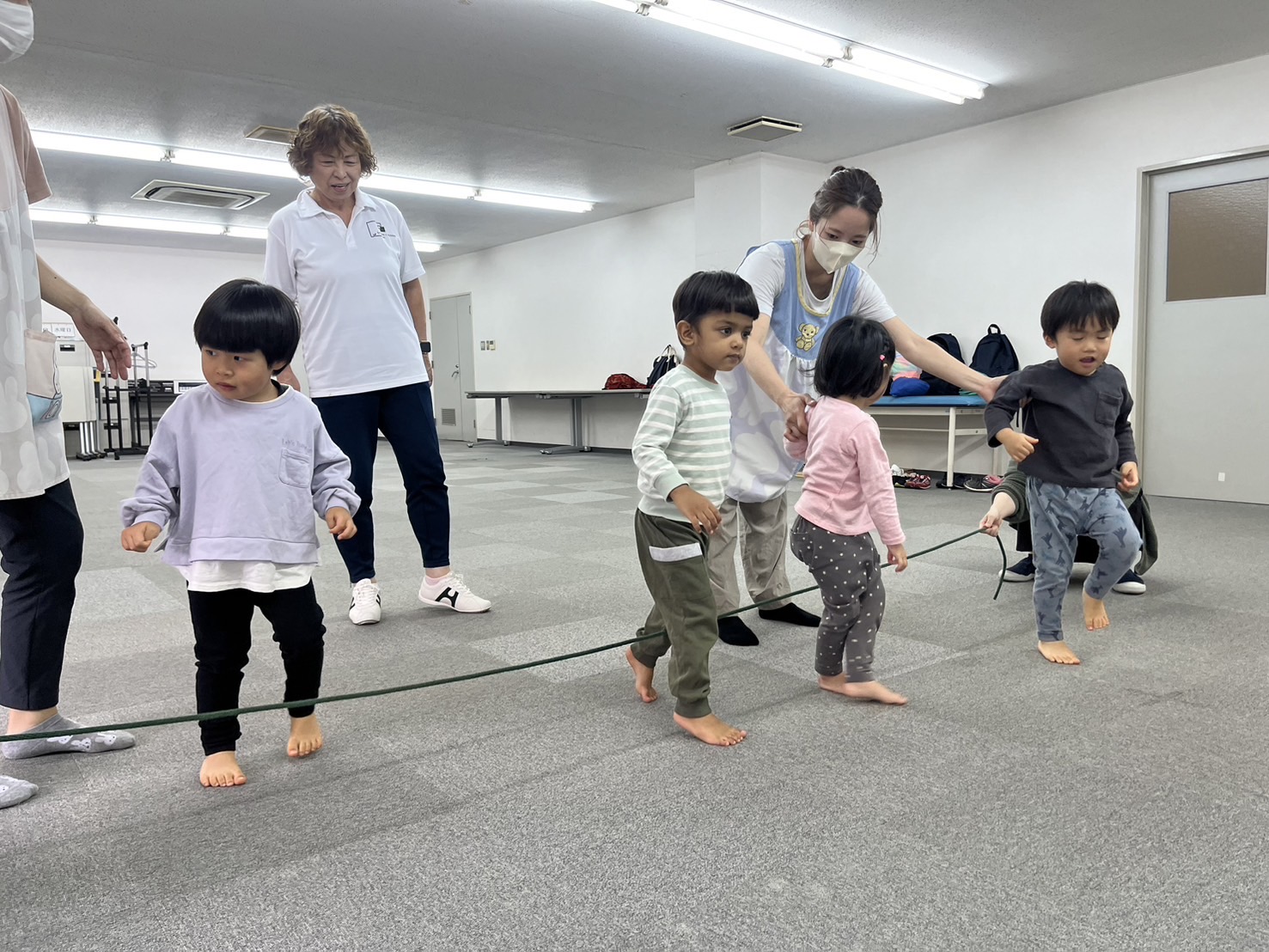 今回のおれんじたっちは、サンコービル3階大会議室にてしっかり体を動かす活動を行いました🌟参加者が縄跳びをにょろにょろヘビのように動かして当たらないよう飛び越え、ちょっと高さを付けて高く足を上げて跨ぎました🐍尻尾取りでは、参加者も子ども達もカラフルな色のスカーフを尻尾に見立てて後ろにつけ、尻尾めがけて力の限り走り回っています🧣その後は、ゆっくり音楽に合わせてパラバルーンをもって歩き、最後は紙玉をポップコーンに見立ててポンポンとはじき出しました🌈