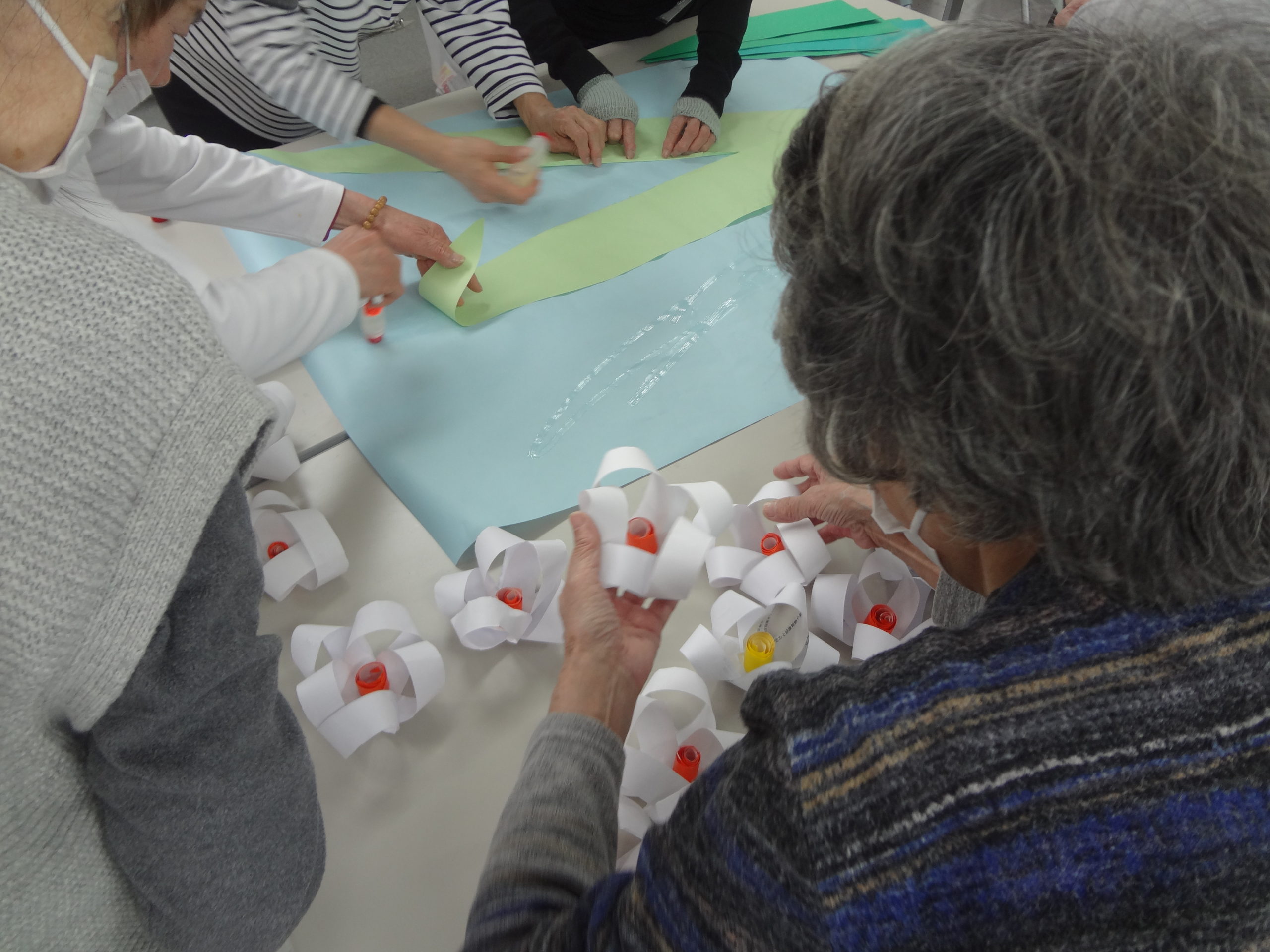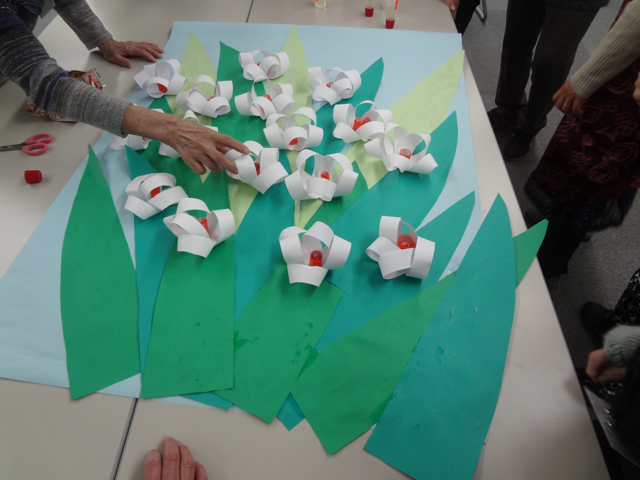 クラフトは、白い紙、オレンジ色の紙を細く切って、水仙を作りました。白い紙5枚とオレンジの紙3枚で1輪です。紙をくるっと曲げてのりで貼ります。いくつも貼り合わせていくので、指先がのりでべたべたになりました。けれども出来上がった作品は、可愛らしく春らしい仕上がりです。共同作業なので達成感もあります。宮地病院1階北側廊下に掲示していますので、お立ち寄りの際にはぜひ見てください。