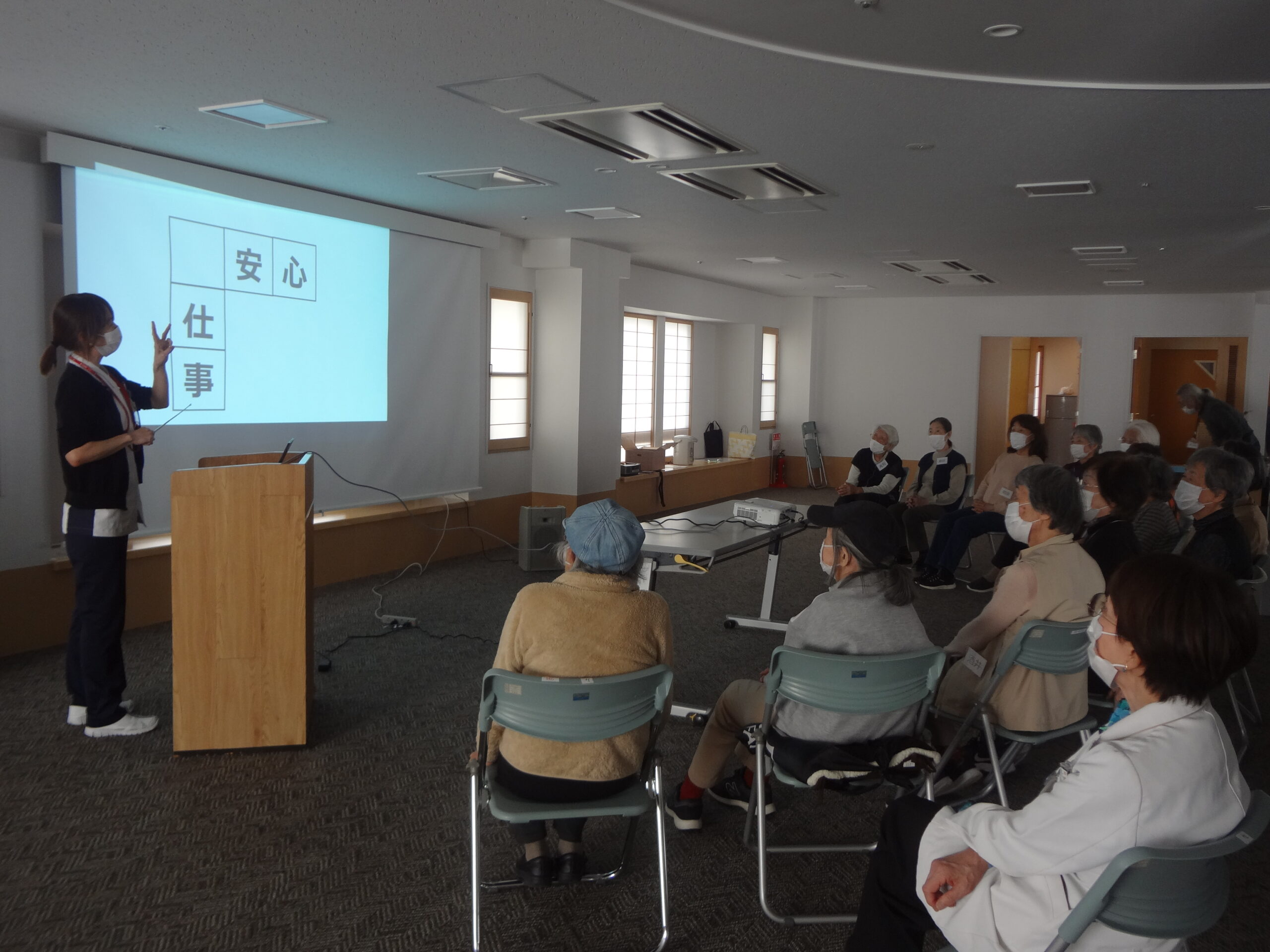 11月のにこにこクラブ健康講座は、宮地病院外来の看護師長から、脳トレについてのお話と実践がありました。スライドに漢字パズルを映して、皆さんで問題を解いたのですが、返答の早い事!!ほとんど即答といっても過言ではないスピードで返答してくださいました。日頃から鍛えられているのですね。参加した皆さんより平均年齢の低いスタッフの方が、返答に時間を要していました。
