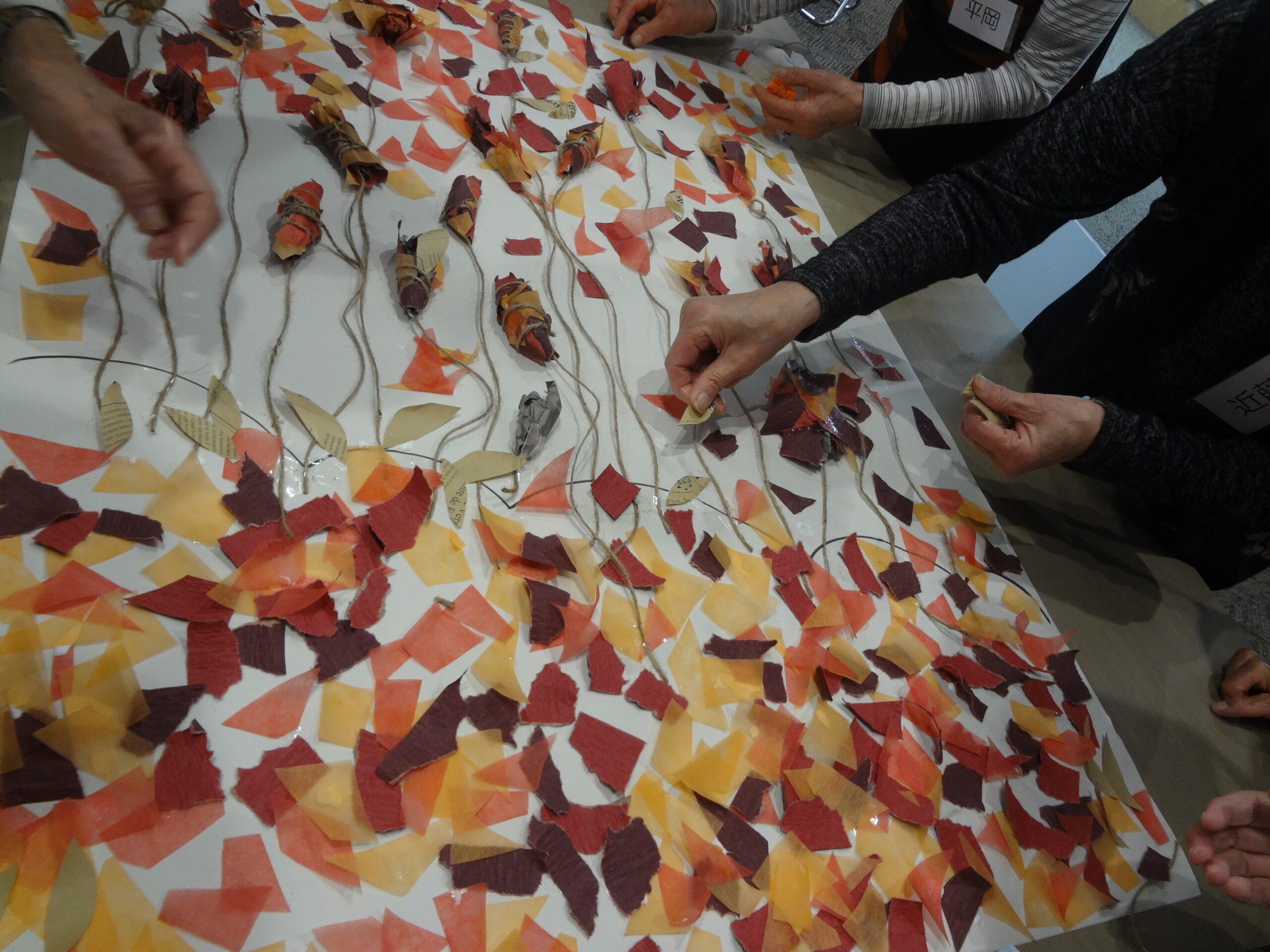 クラフトは、「みのむし」を作りました。最近みのむしを見ることが少なくなりましたね。以前はどこにでもいたものでした。秋色の紙を貼り合わせてみのむしを作り、ヒモで吊るして飾っています。「みの」の紙に英字がプリントされた包装紙を使用したのですが、それがまたアクセントになって、おしゃれな仕上がりになっています。いつものように宮地病院北側廊下に展示していますので、よろしかったら見に来てください。