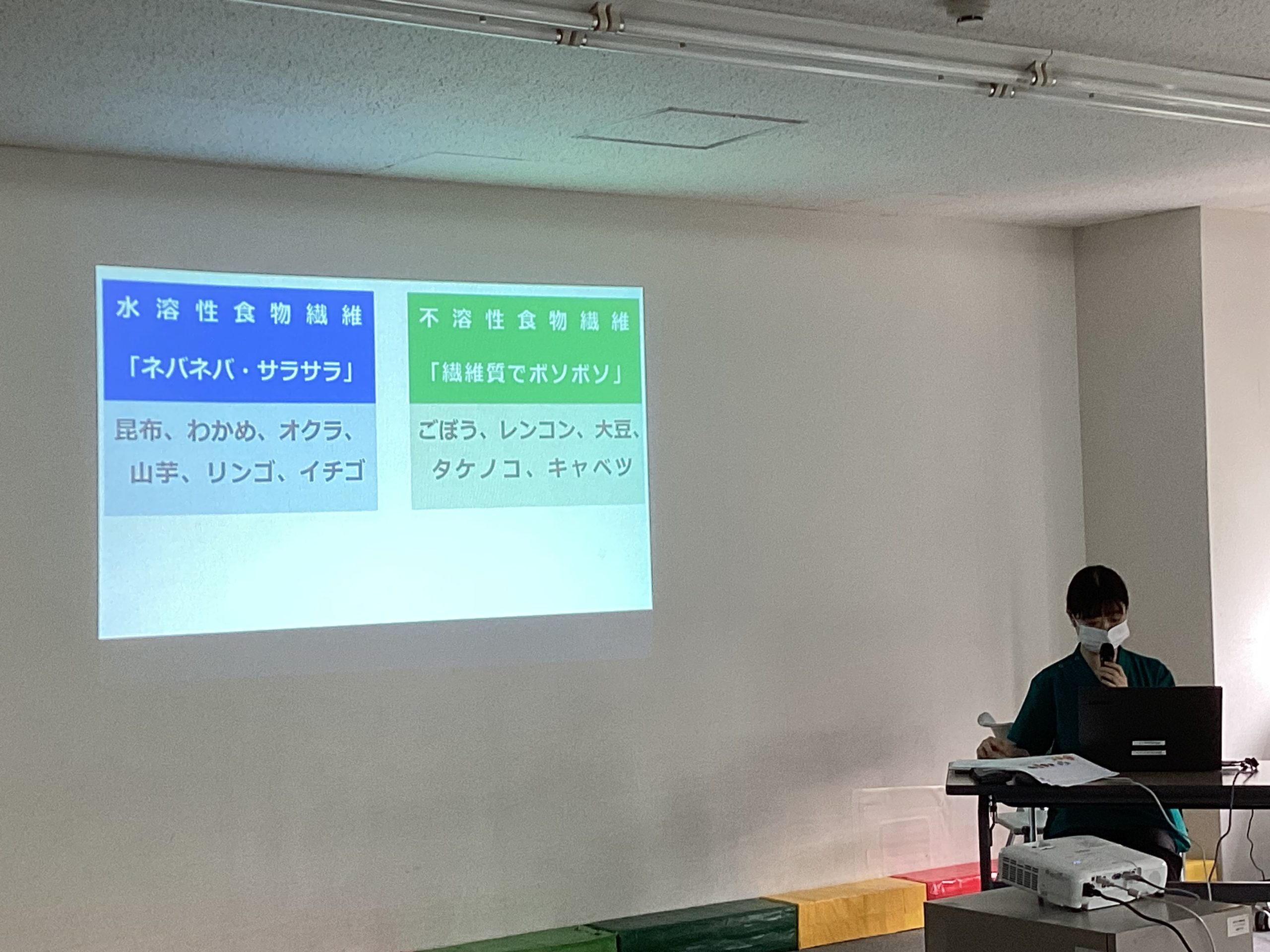 便秘の原因、便秘が改善する生活習慣とはどんなことか、便秘解消にはどんな食事が良いのかについてクイズを交えながら説明しました。最後は簡単に食物繊維を増やせるアレンジ方法を説明しました。クイズには積極的に挙手していただきました。メモをとる様子がうかがえ、最後まで真剣に聞いてくださいました。みなさんの排便習慣が少しでも改善すれば嬉しく思います。