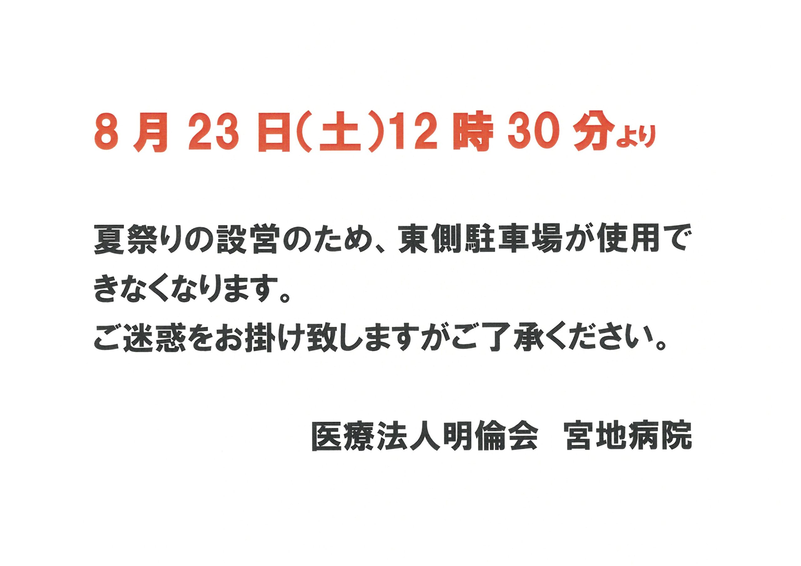 ※当日午後から東側駐車場は夏祭り準備のためご利用できません。ご協力よろしくお願い致します。