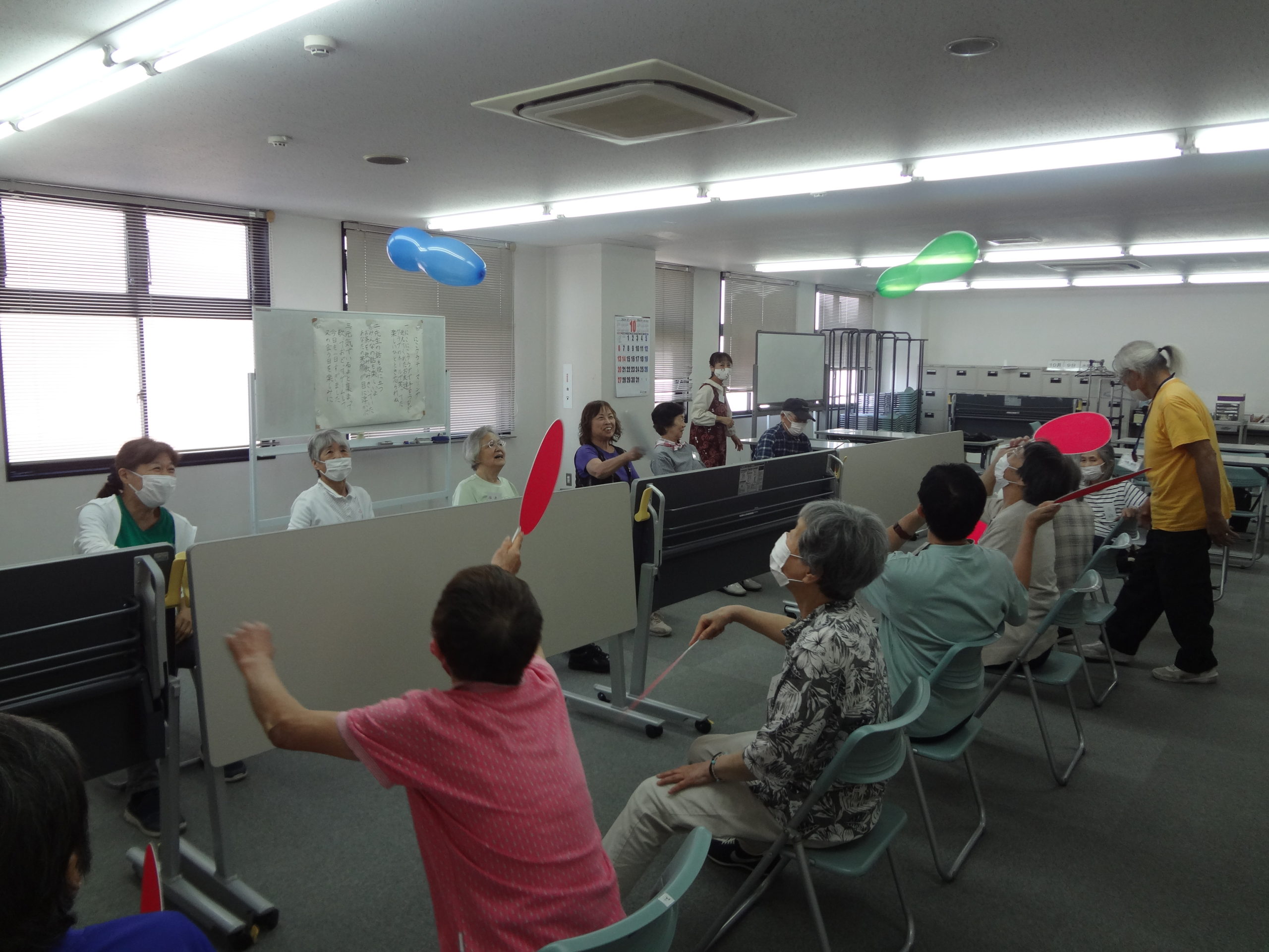 ゲームは、2チームに分けて、風船バレーです。テーブルをネット代わりにして、5つの風船を打ち合います。1分後、自分たちの陣地にある風船の数が少ないほうが勝ちです。3回戦まで実施しましたが、情け容赦ない打ち合いの結果、息が切れるほどの運動となりました。いい汗かきました。楽しみながら運動できるゲームは、とてもいいものです。
