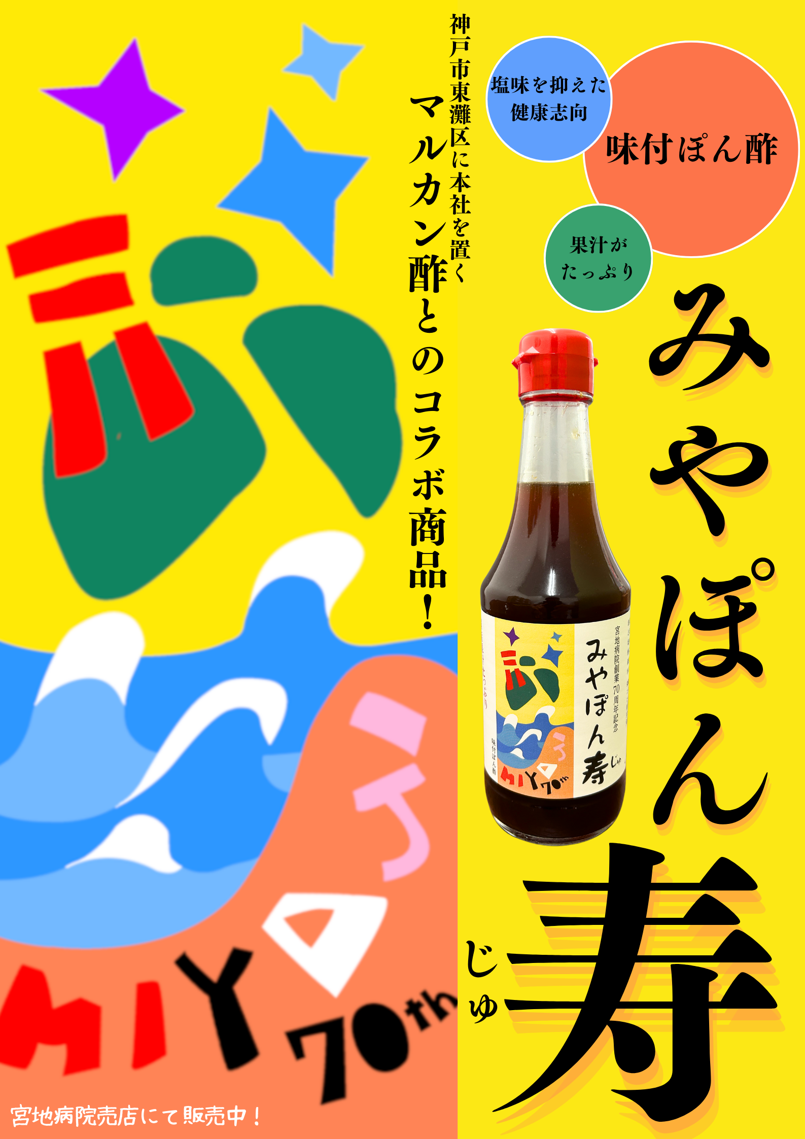 宮地病院創業70周年を記念し、東灘区向洋町に本社を置く「マルカン酢株式会社」様とオリジナルぽん酢「みやぽん寿」を共同開発しました。