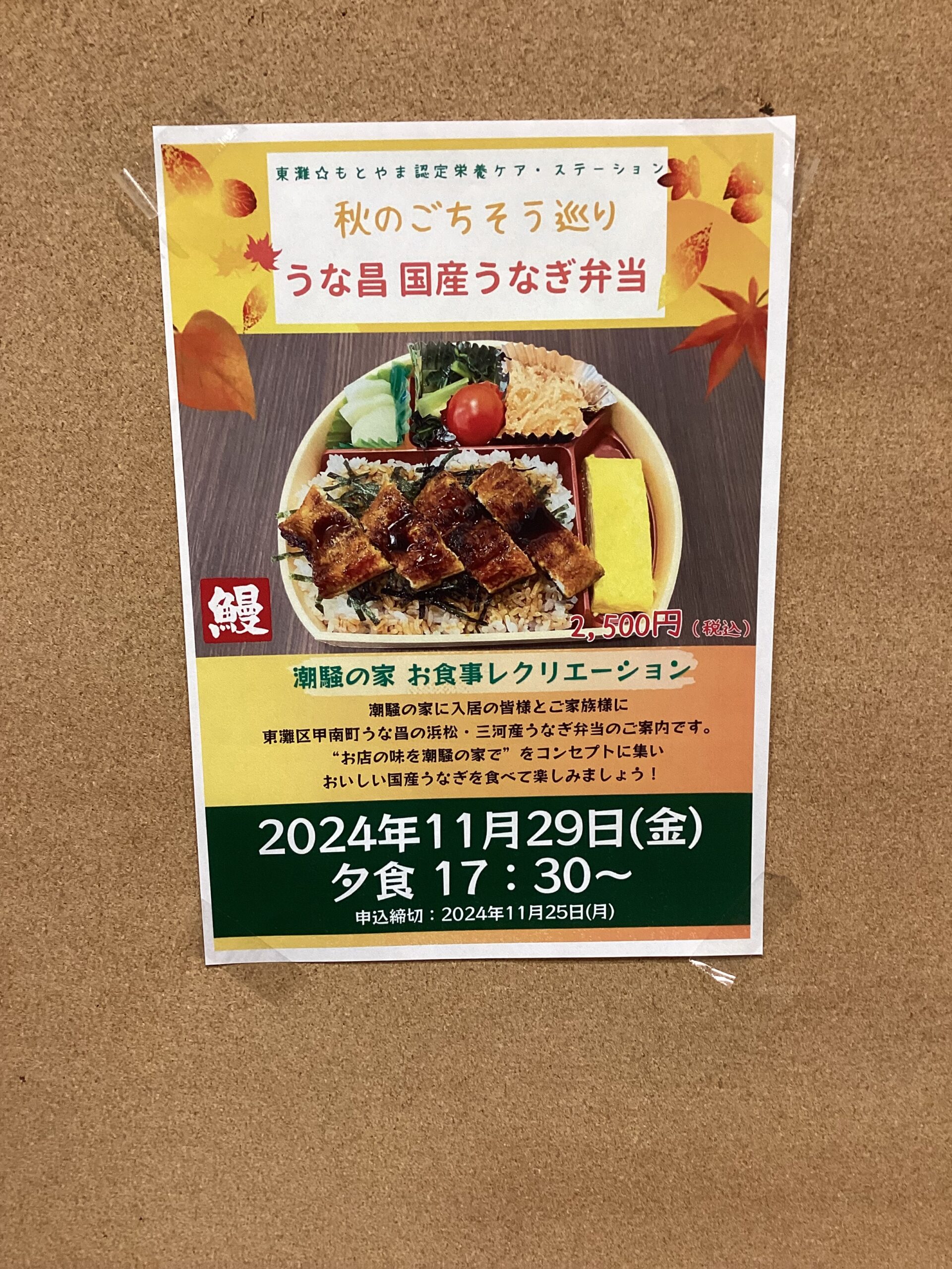 サービス付き高齢者住宅「潮騒の家」に入居の皆様に、“お店の味を潮騒の家で”をコンセプトに、東灘区甲南町「うな昌」様とコラボレーションして三河産うなぎ弁当を夕食に提供しました。