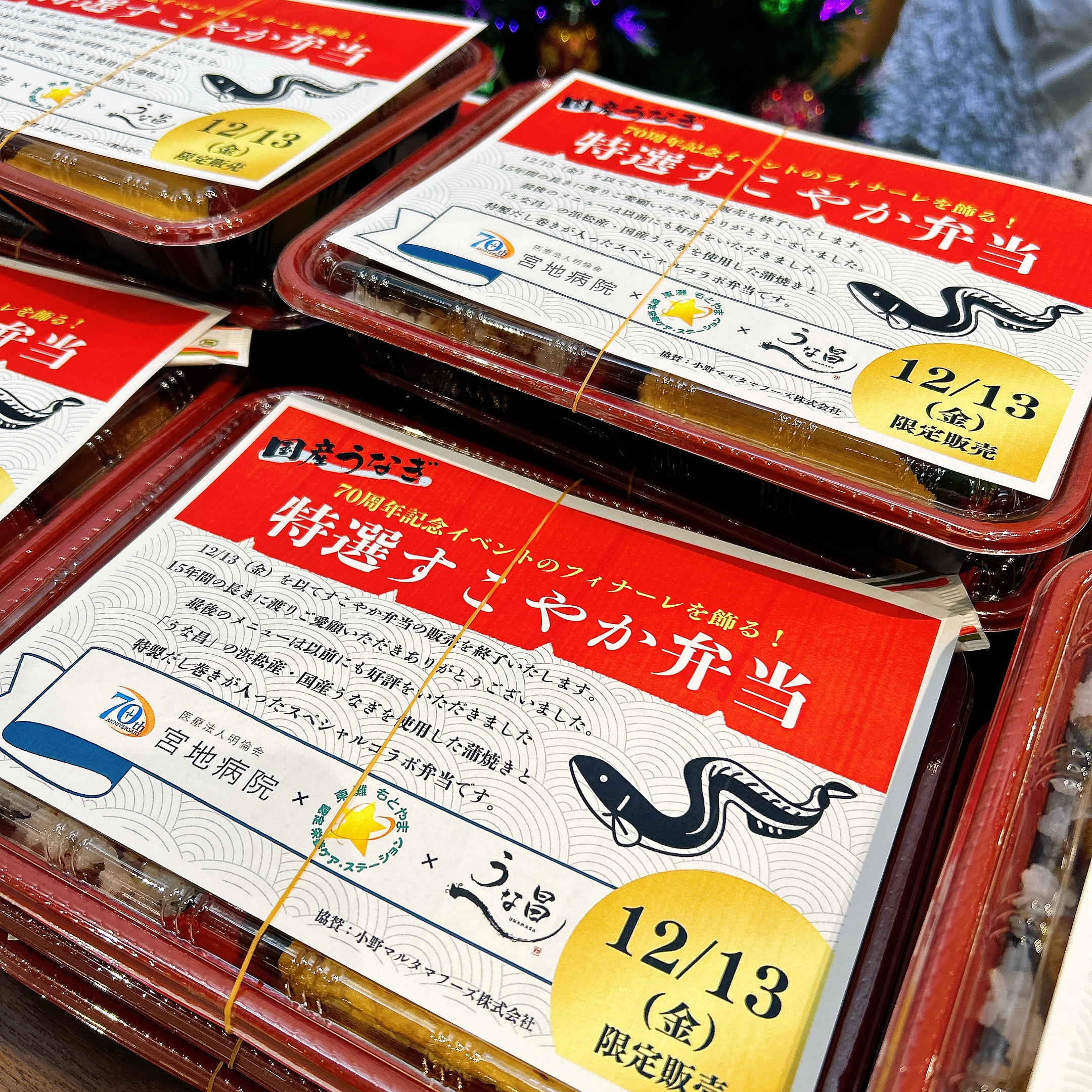宮地病院創業70周年、ならびに「すこやか弁当」販売15周年の記念イベント企画。そのフィナーレを飾ったのは、多くのご好評をいただいた、神戸市東灘区甲南町「うな昌」様とのコラボレーションによる「特選うなぎすこやか弁当」の販売です。