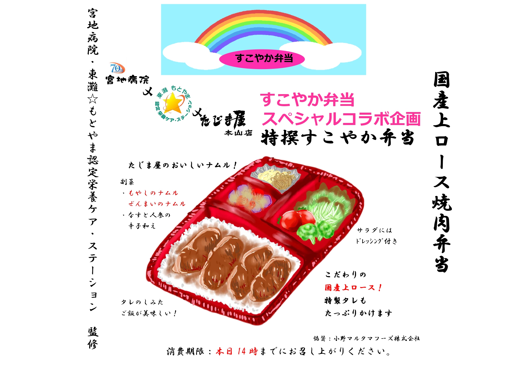 宮地病院創業70周年・すこやか弁当販売15周年を記念して、東灘区本山中町の焼肉屋「たじま屋 本山店」様とコラボレーションして「国産上ロース焼肉すこやか弁当」を販売しました。