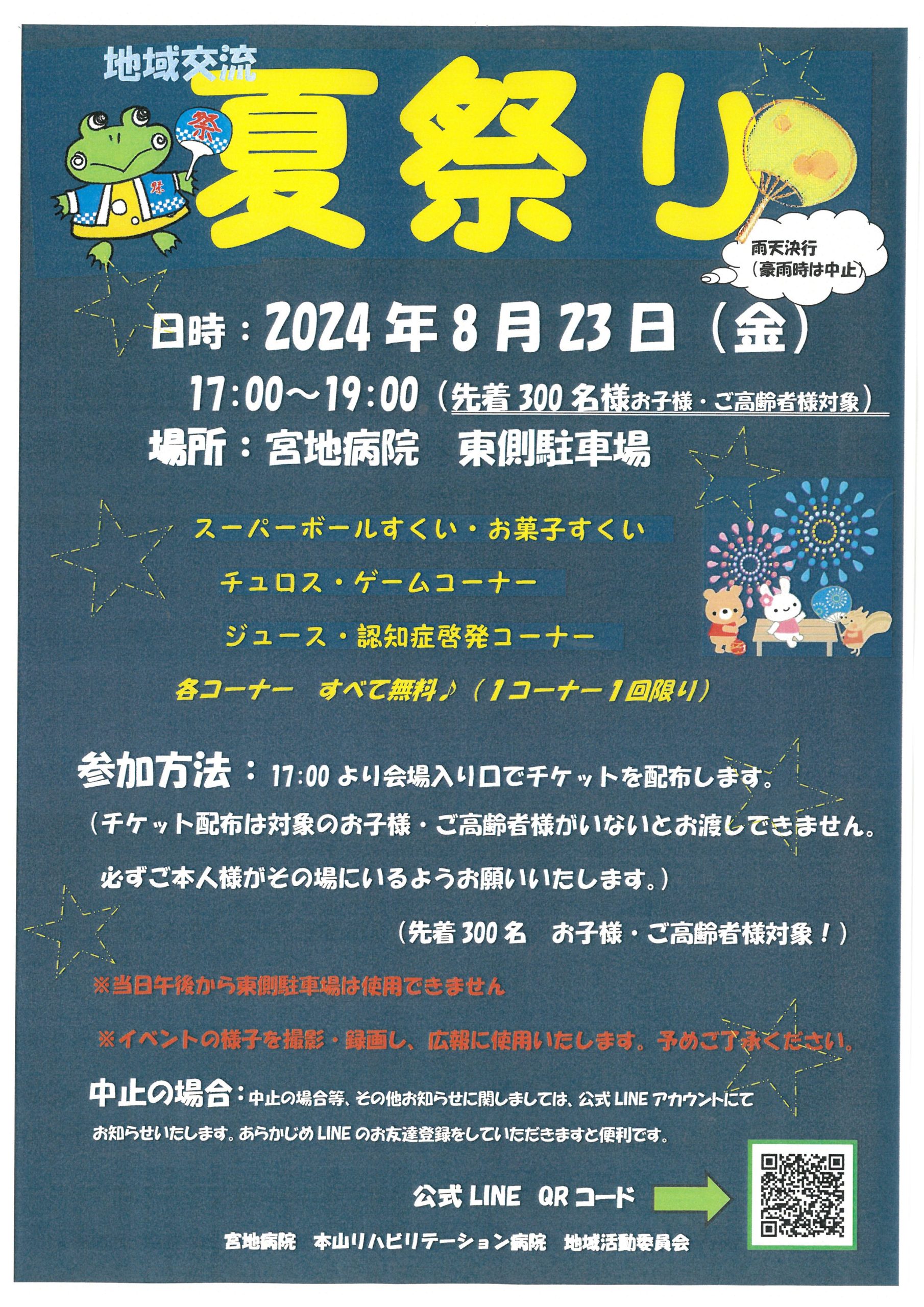 | 場所 | 宮地病院 東側駐車場 ※当日午後から東側駐車場は夏祭り準備のためご利用できません。ご協力よろしくお願い致します。 |